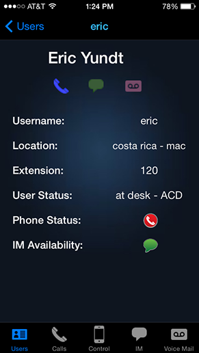 Tap the phone, IM or voice mail icon to place a call to the user, start an instant messaging session with them or leave them a voice mail without calling them.