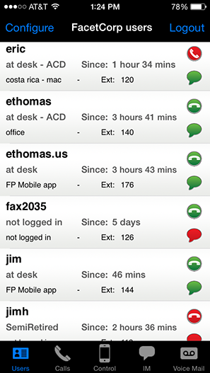 • For each user, you can see their name, their extension number, their current location and status. The phone and IM icons indicate their availability for phone calls and instant messaging sessions.